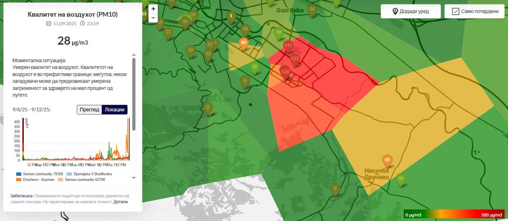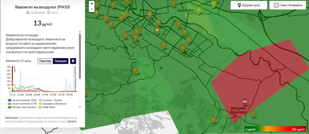 До полноќ чадот се движи и кон Маџари и Гази Баба, каде околу 00 часот се регистрира највисокото ниво на загадување. Особено драматично беше вчера во Драчево, каде што околу 23 часот загадувањето го достигна максимумот од 400 PM10 честички – вредност која спаѓа во категоријата „опасно“ според сите меѓународни стандарди.