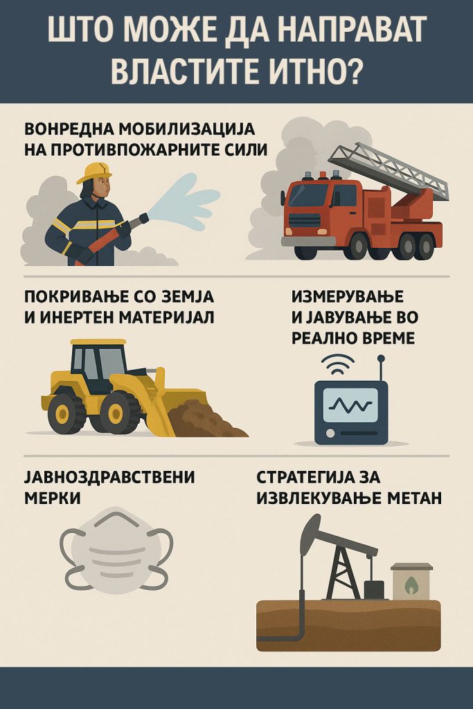 - Стратегија за извлекување метан – итно планирање и набавка на системи кои ќе го извлекуваат гасот од депонијата за да се спречат нови палења. Еј одговорни – ете ви идеја за бизнис со метан!