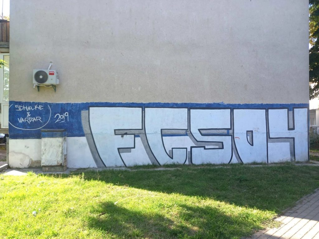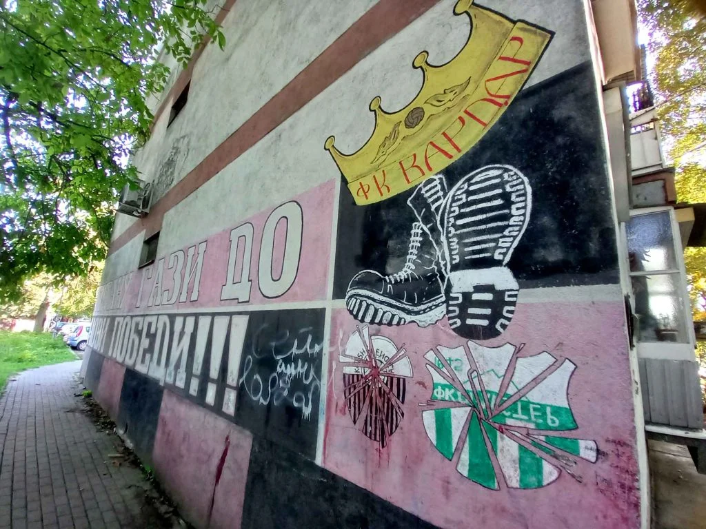 I continue on and come across a few more graffiti dedicated to the football club Vardar. The supporter groups, it seems, are the only ones leaving a lasting mark in this neighborhood. But even these works seem pale compared with the vivid murals I had imagined. I realize that an urban Madzhari may never have existed, even though through my friend I knew many alternative kids, metalheads, and musicians from this neighborhood.