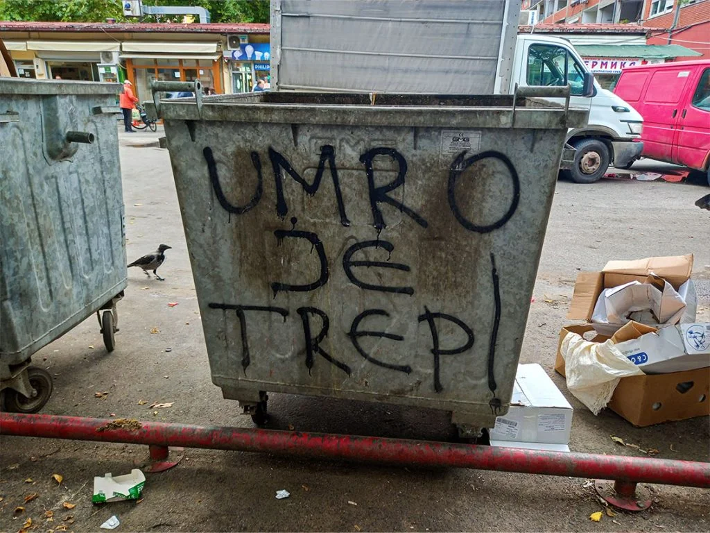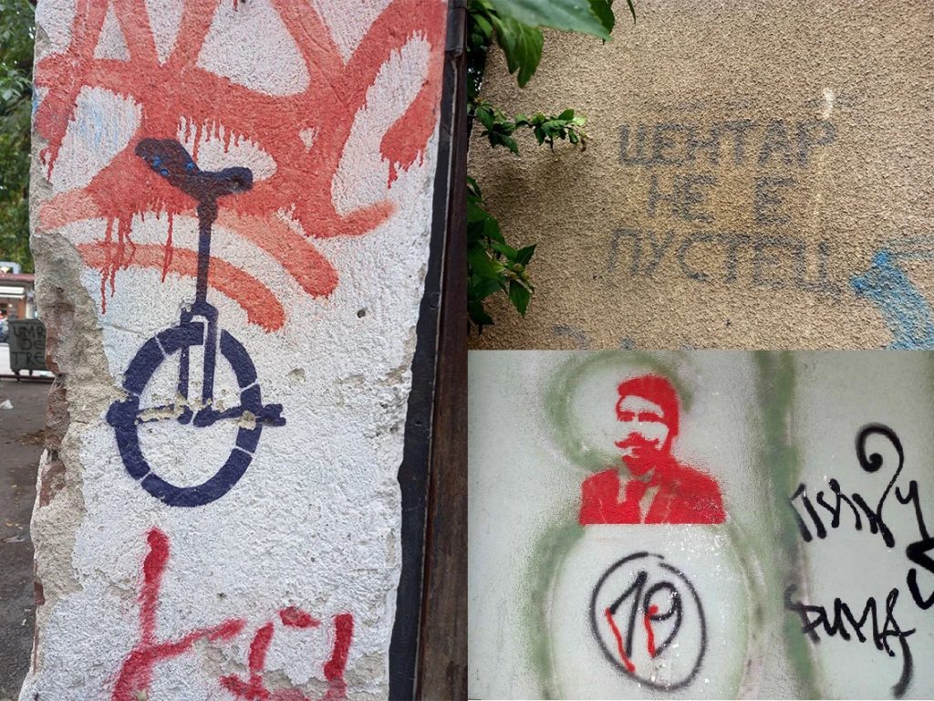 While Fontaines D.C., Silverbacks, Wine Lips, Panic Shack, Idles, Stiff Richards, Teen Mortgage, Death Lens, and other newer bands from a punk-rock compilation on Spotify played through my headphones, a stencil of Goce Delchev greeted me in front of the Green Market entrance, as if reminding me of another time, of ideals we long ago forgot. Next to it: “Centar is not Pustec” – a political message wrapped in urban protest. And a strange pictogram of a unicycle. (Monocycle? And in Macedonian it should literally be “one-wheel,” right? While bicycle would be “two-wheel.” Language is a strange thing.)