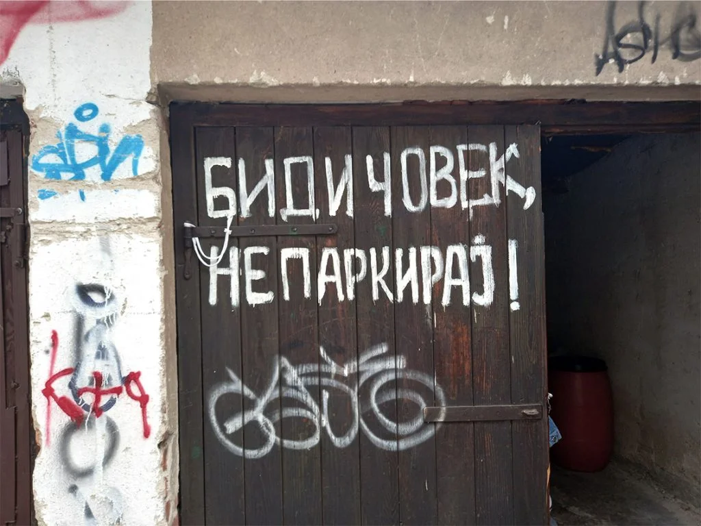 On an old wooden garage, painted in greasy white, someone has written, “Be human, don’t park,” and a little lower down, “Death to fascism, freedom to the people.” They remind me of what graffiti once used to be – a bulletin board for citizens, a reminder of the important things in life and politics. I wonder whether people respect this appeal to humanity.