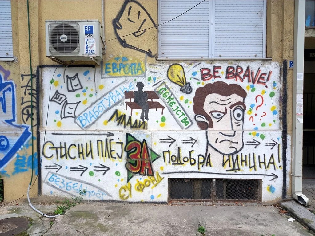 Green Market in Skopje. Between stalls stacked with “plastic” tomatoes and walls scrawled with messages, I discover a story about our city in constant transition. Here, graffiti is not merely vandalism – it is a mirror of our hopes, frustrations, and daily life. The heart of Skopje, a place where vegetable prices change more often than the political slogans on the walls, and where art sprouts up even where you least expect it.