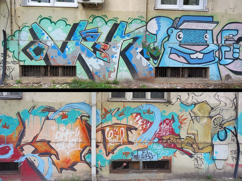 I hop onto my two-wheeler and come back another day to photograph the graffiti on the side facing 11 Oktomvri Boulevard. This is the real gallery of Skopje – one of the most beautiful in the city. The familiar Skopje drawing faces dominate once again.