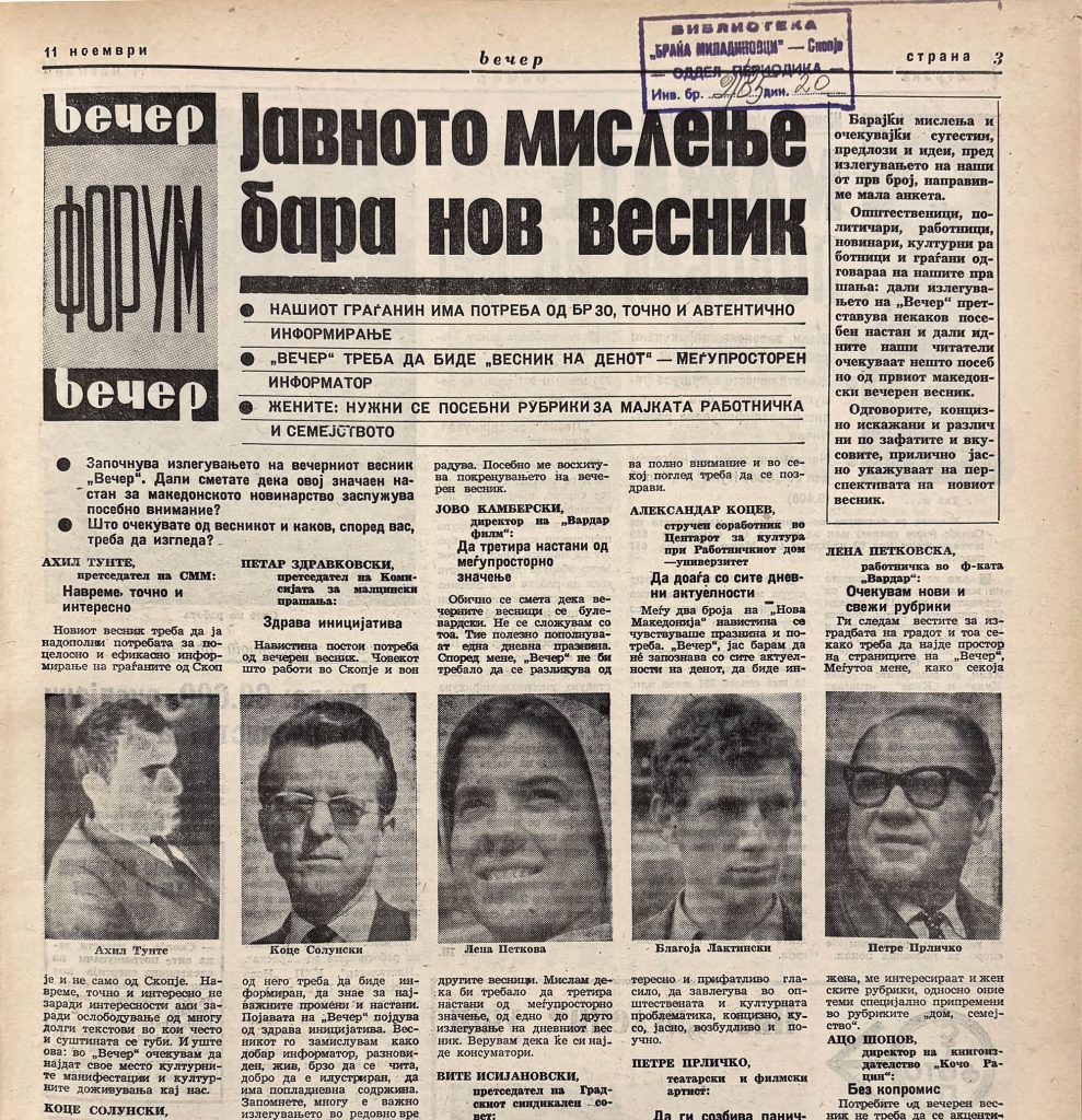 Дополнително, „Нова Македонија“ бележи дека во времето кога директор бил Лазар Мојсов, група новинари меѓу кои Бранко Заревски, Бане Ковач и Лазо Кавалот почнале да го издаваат весникот „Вечер“ – не денешниот по земјотресот, туку едно поранешно издание со ист наслов (за кое пишувавме и ние).