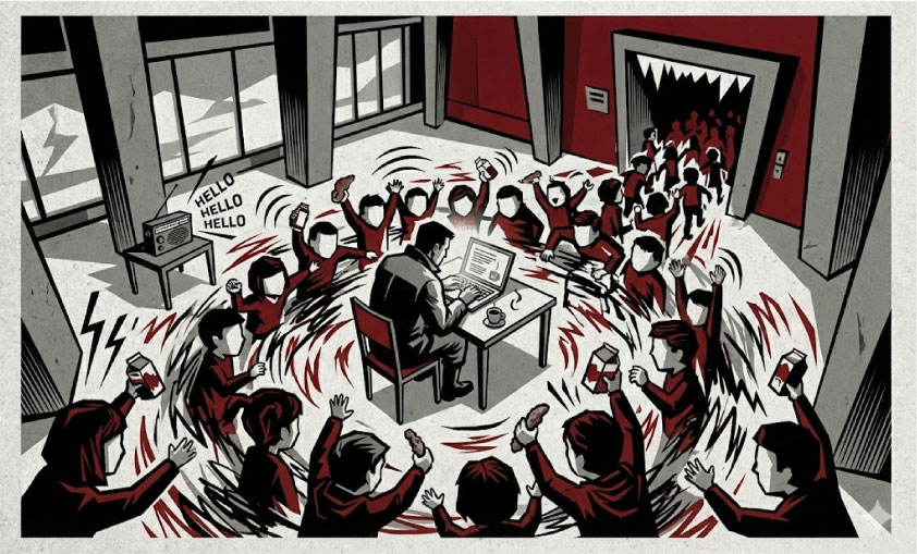 Како за инат, радиото ми пушта Hello – Hello, is it me you’re looking for? – и јас си велам: Да, баш, вас ве барав. Супер ми е! Пишувам најдобро кога сум опкружен со хаос. Тоа е мојата природна средина – како жаба во кал, само со тастатура.