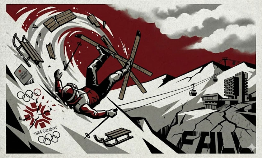 Се сеќавам кога татко ми првпат ме однесе на Јахорина. 1987. Немав ни десет. Стоиме горе и гледаме долу – облаци, така мислев. Или тоа беше само мојата детска потреба светот да изгледа поголем од станот и од распоредот. Знаев да скијам. Барем мислев дека знам. Ние на врв планина. Стрмна удолница под нас. Јас се пуштам како да сум Бојан Крижај – цик-цак, крст-криж, грациозност, Сараево осумдес-четврта. И нормално – се истумбав како Алберто Томба, само без победа, без стил, без ништо (иако направив 5-6 пируети и салта. Кога се освестив, ги гледам везовите на половните скии – неодврзани. Судбината ми држела предавање.