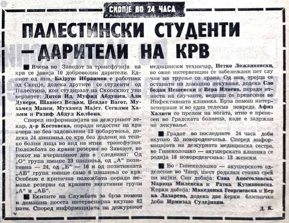 Овде има момент што денес ретко се чита со истата тежина: палестински дарители на крв помагале во Скопје. (А како Македонија им враќа денес!?)