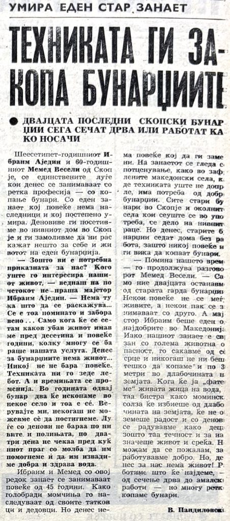 Шеесетипетгодишниот Ибрахим Аједин и 60-годишниот Мемед Весели од Скопје, се единствените луѓе кои денес се занимаваат со ретка професија — со копање бунари. Со еден занает кој повеќе нема наследници и кој постепено умира. Деновиве ги посетивме во нивниот дом во Скопје и ги замоливме да ни раскажат нешто за себе и животот на еден бунарџија.