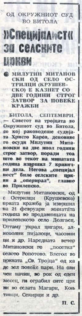 И тука е еден друг, важен слој: социјализмот не значи „нема криминал“. Има човек што краде по цркви. И весникот го бележи тоа, со име и презиме, а така биле ословувани сите сторители на кривични дела тогаш – јавно и гласно, сите да знаат, наместо скриено и тајно, со иницијали! И тоа замислете, криминал по религиозни објекти во социјализмот кој бил жестоко санкциониран.