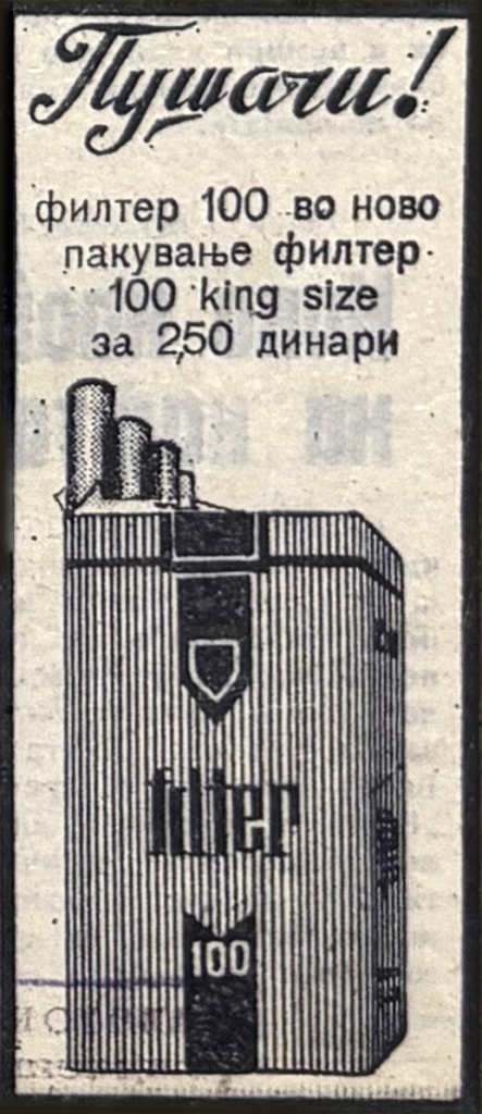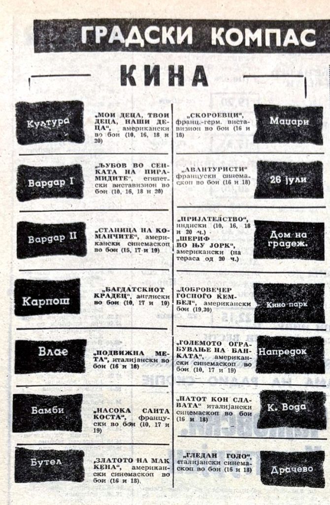 И конечно – кино програмата. Тоа е, за мене, еден од најважните „индикатори“ за тогашниот урбан живот. Не затоа што филмовите се „подобри“ по дефиниција, туку затоа што има мрежа: Култура, Вардар I, Вардар II, Карпош, Влае, Бамби, Бутел, Маџари, 26 Јули, Дом на градежници, Кино-парк, Напредок, Кисела Вода, Драчево…
