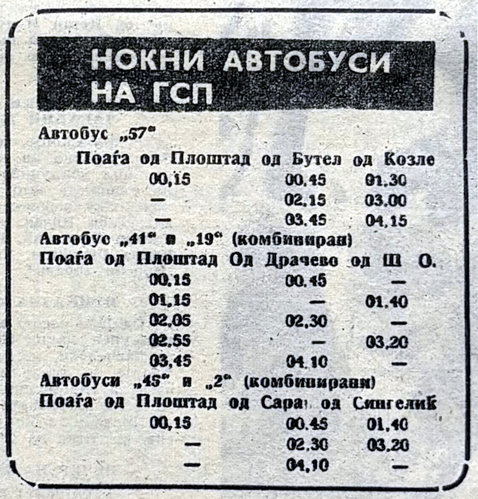 Во рубриката со возови и автобуси има нешто што денес звучи речиси неверојатно: ноќни автобуси на ГСП (денешно ЈСП). Линии што одат по полноќ. И да – ако денес последниот автобус за Драчево (бр. 41) е во 23:10 – тогаш, пред 56 години (и тоа кон една населба периферна населба) сообраќале цела ноќ!