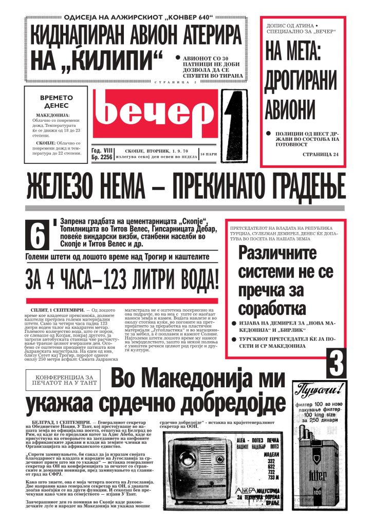 Овој текст е обид за пресек: што значи еден ден во Скопје и Македонија, на 1 септември 1970 година, гледано низ исечоци, рубрики и ситни детали. Нема да се задржувам премногу на „моето“ (како што многу често знам!) – тука поважно е „нашето“, тогашното, дневното. А културата и кината, намерно ги чувам за крајот, како што често и во животот си ја оставаме утехата за на крај.
