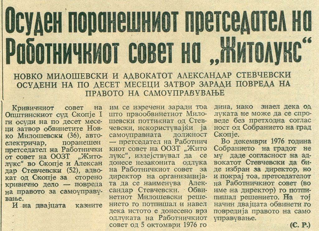 Во Скопје, пак, правдата удира во фабриката за леб „Житолукс“. Директорот и претседателот на работничкиот совет добиваат по 10 месеци ефективен затвор. Нивниот грев не е проневера на милиони, туку „повреда на правото на самоуправување“ – ја изиграле процедурата и го заобиколиле Собранието на Градот при именувањето. Тогаш, за процедурално самоволие се одело во затвор, бидејќи хиерархијата на одлучување била светиња.