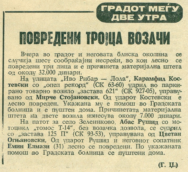 Асфалтот од 1978 година мириса на бензин и хашиш, а полициските билтени се прецизни, со целосни имиња и регистарски таблички. Црната хроника ни отвора прозорец кон возниот парк на нацијата: на „Иво Лола Рибар“ се судираат луксузен „Опел Рекорд“ и паркирана „Застава 621“, додека кон Зелениково еден „Томос Т-14“ (возен без дозвола) удира во популарниот „Пезејац“ (Застава 125 П).