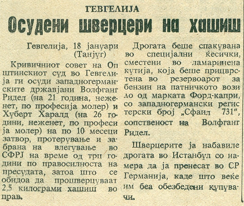 Но, вистинскиот крими-трилер, достоен за филмот „Полноќен експрес“, се одвива на јужната граница. Двајца млади Германци се фатени во Гевгелија со 2,5 килограми истанбулски хашиш напикан во резервоарот на култно спортско купе „Форд Капри“. Балканската рута очигледно работела беспрекорно, но југословенската царина не простувала – казната била затвор и протерување. За тоа време во Скопје, судовите се еднакво сурови кон уличниот криминал: еден крадец добива астрономски 11 години затвор за серија кражби од автомобили со „мајсторско“ отворање на прозорците.