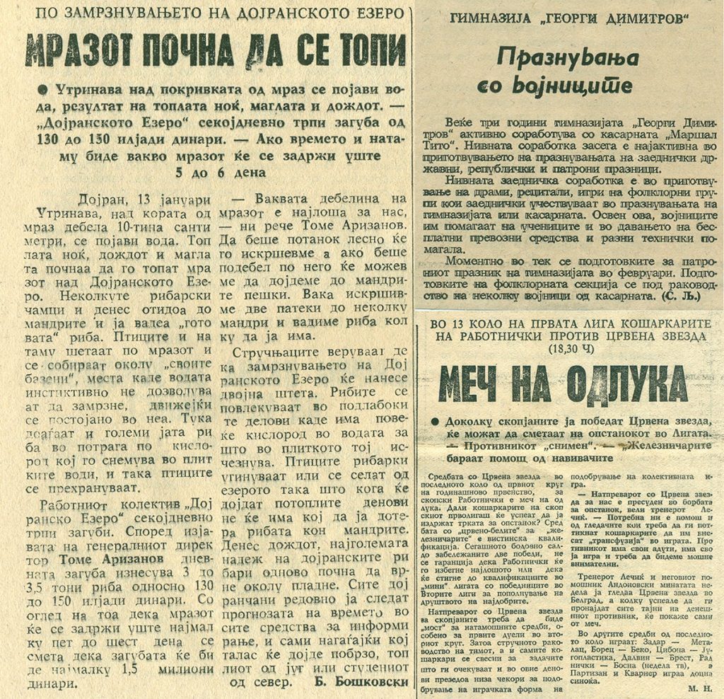 Во Скопје, спортската јавност е на нозе – кошаркарите на „Работнички“ се подготвуваат за историски „меч на одлука“ против белградска „Црвена ѕвезда“ за опстанок во Првата лига (натпревар во 18:30 часот). Истовремено, во скопската гимназија „Георги Димитров“ се одвива нешто што денес звучи неверојатно: војници од касарната „Маршал Тито“ не само што даваат воени камиони за школска логистика, туку и активно ја водат фолклорната секција на гимназијалците.