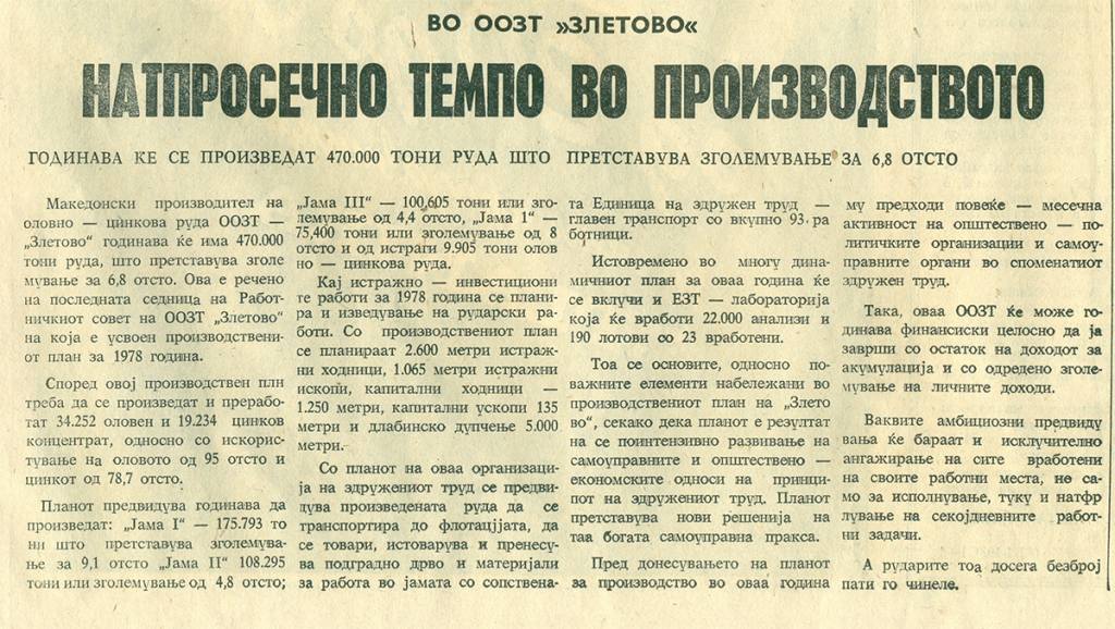 Читајќи го економскиот извештај за претходната 1977 година, како да читаме хроника на друга планета. Системот бележи физички обем на индустриски раст од 12,8% и самостојно одржува дури 30 различни индустриски гранки! Тоа е време кога Македонија произведува сè – од машиноградба и базна хемија, преку 470.000 тони руда ископани во „Злетово“, па сè до облека за најмладите, каде што гигантот „Наше дете“ отвора пет нови дуќани за да стигне до мрежа од 53 продавници низ републиката.