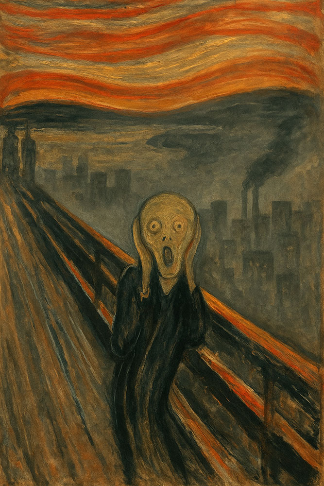 Кога Едвард Мунк би живеел во Аеродром, неговиот „Крик“ би бил автопортрет на граѓанин што вика задушен во смогот над Вардар. Наместо фјордови – индустриски оџаци. Наместо неонско небо – портокалова зора.