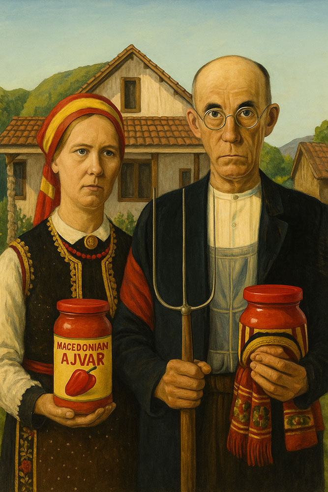 Да ја замениме фармата со село во Пелагонија. Да ја замениме пченката со пиперки, и бидете сигурни: Грант Вуд би ја насликал истата сцена – сериозен брачен пар пред селска куќа, тој со вила, таа со тегла ајвар.