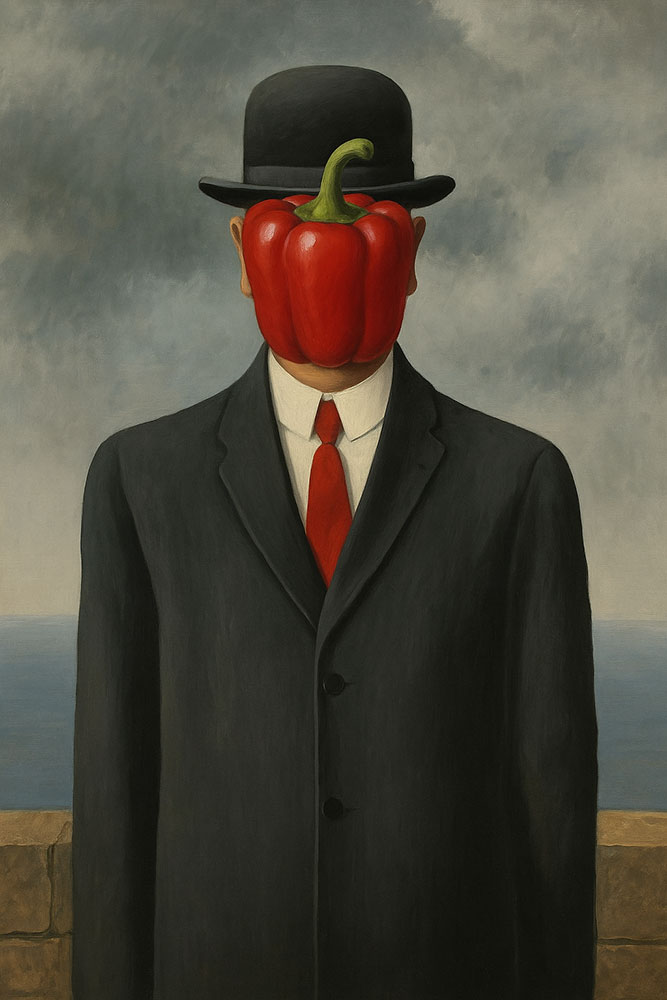 Рене Магрит би бил фасциниран од нашата реалност. Неговиот „Синот на човекот“ кај нас би носел кече од Бит Пазар, а наместо јаболко би имал црвена пиперка пред лицето.