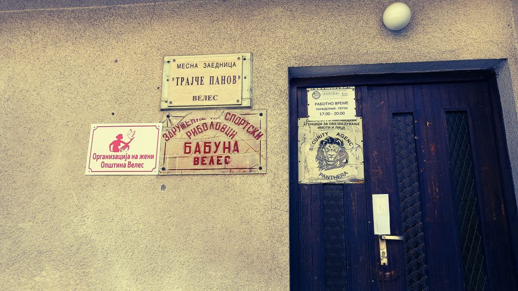 Во запуштениот парк до Месната заедница „Трајче Панов“ (гуглам: 1921–1942, партизански командант кој падна во борба против бугарските окупатори на само 21 година) – какофонија од табли: дали се активни, дали делат простории, дали само се наслагани низ годините? „Здружение на спортски риболовци ‘Бабуна’ Велес“; огромна грда лепенка „Security Agency Panthera“, со лав што треба да плаши. Позади шушка: дали ова е урбана типографија или административен шум?