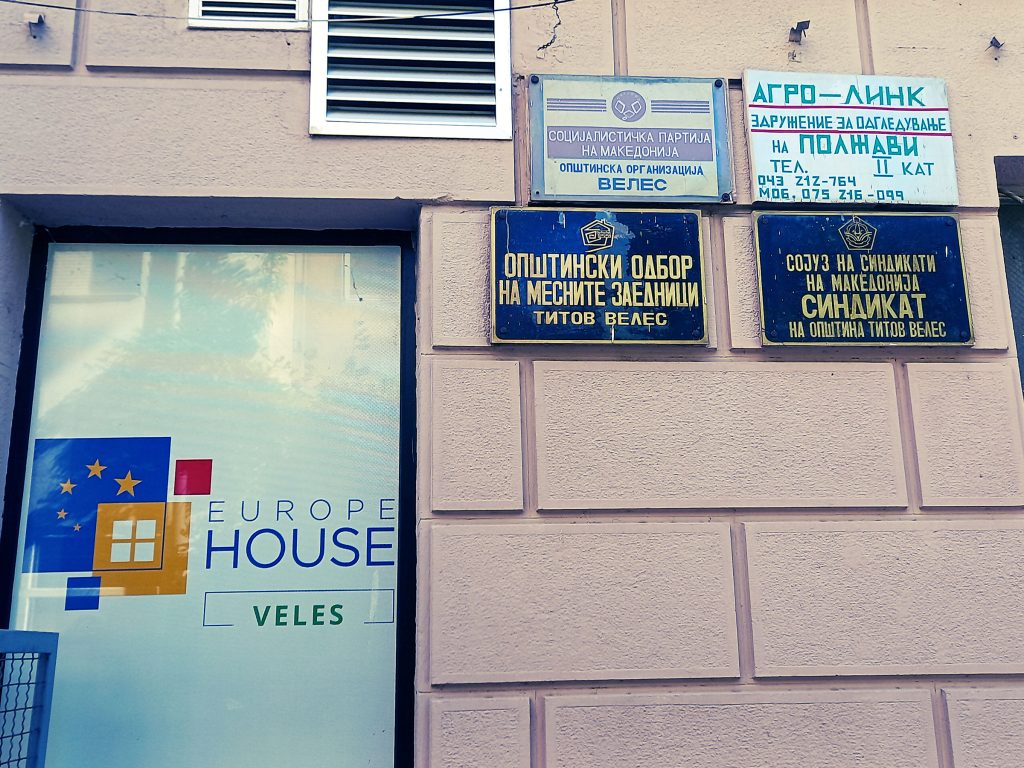 Истата таблична какофонија како кај Месната заедница ја гледам и кај страничниот влез на Europe House Veles: „Социјалистичка партија на Македонија (општинска)“, „Агро Линк – здружение за одгледување полжави“, „Green Power“, „Здружение на инвалидски пензионери Велес“, „Општински одбор на месните заедници Титов Велес“, „ССМ – Синдикат на општина Титов Велес“… Административен хаос! А полжавите?! Во дворот – навистина симпатичен мурал со птичка.