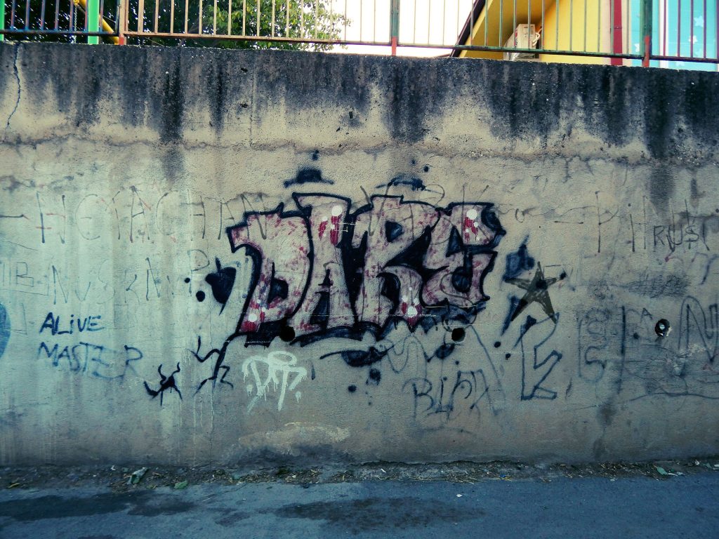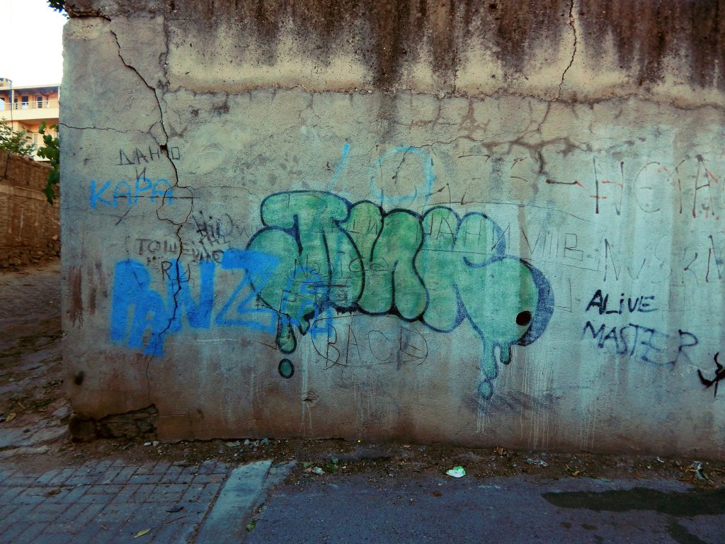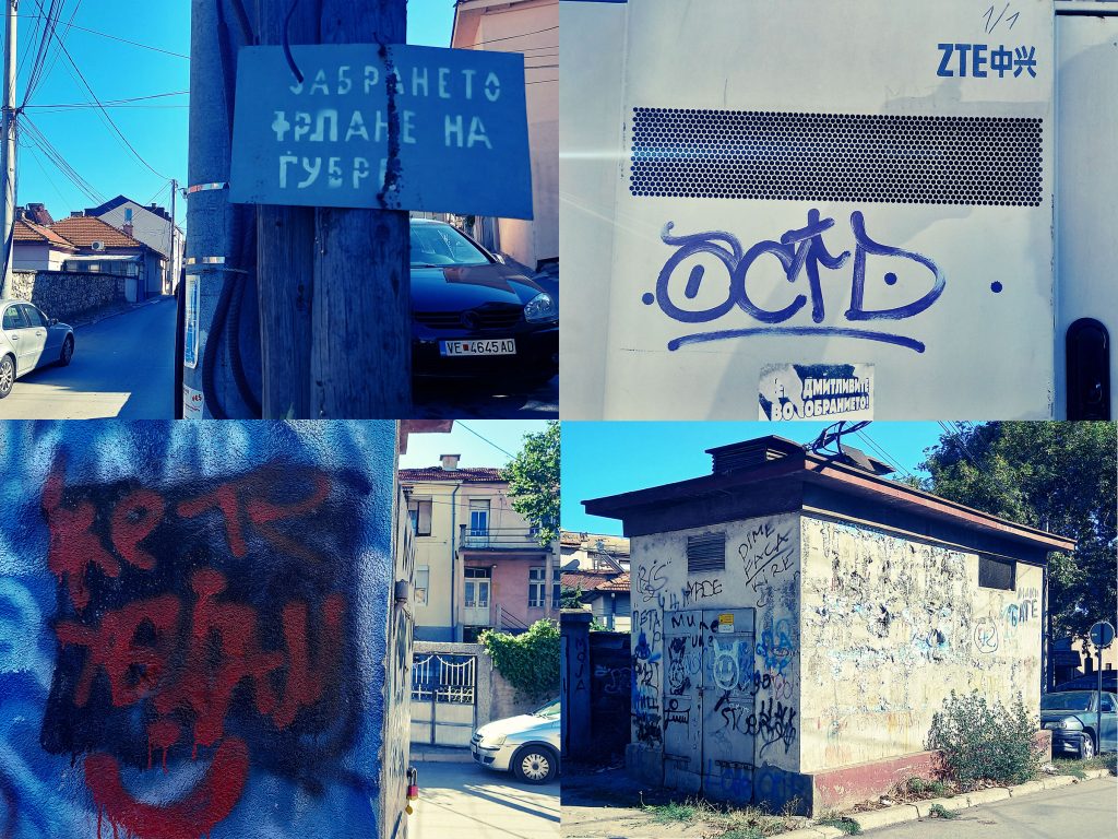 Првите графити што ги гледам во Велес се политички: „Порцоланка ќе ја от(вора)ле, Улави!“ – коментар на вечните иницијативи да се реанимира фабриката за порцелан. Урбани мурали како општински иницијативи постојат, ама „спонтана“ графити култура – речиси не, барем до сега. Можеби ѕидовите се свежо пребоени; можеби некој вредно брише. Очекував барем некаде да утнат. Од графитите што ги има – две категории: политички пароли (најчестиот „Името ни е идентитетот) и графити кои се чист вандализам (најчесто имиња).