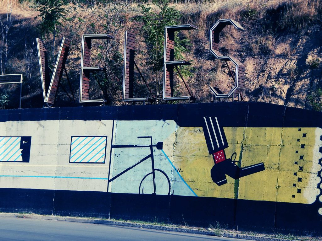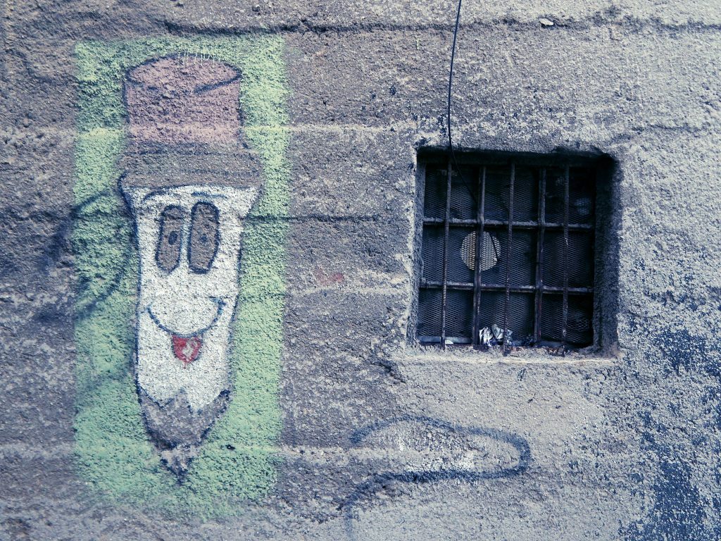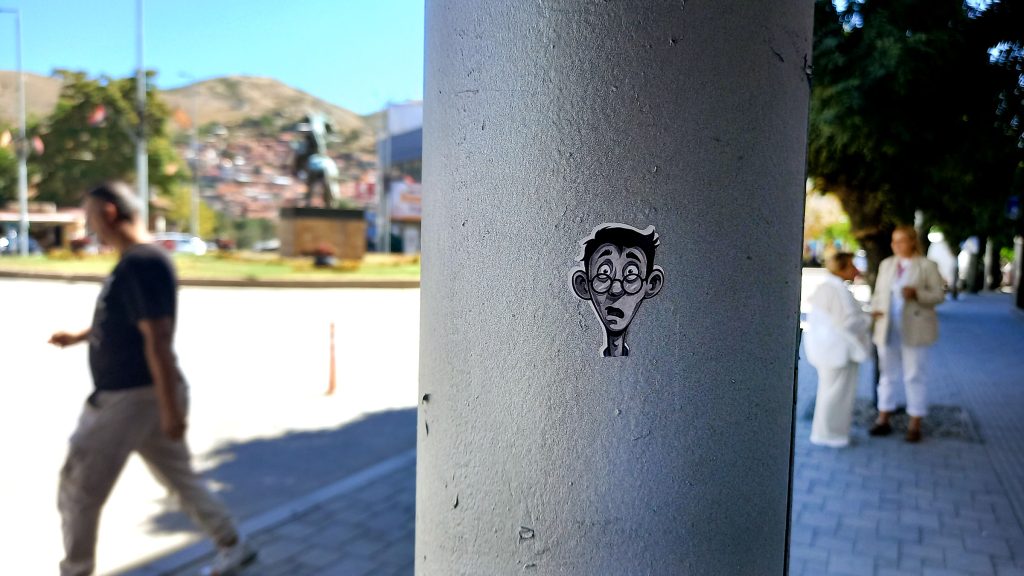 Велес е стрмен како моето Сараево. Тесни улички, стари порти, турски куќи, чешмички, вода што се слева по улици. Се спуштам и пред главниот пат налетувам на графит што личи на ганџа (Towlie од South Park), и така го запишувам во нотесот за белешки (а всушност е молив), и еден Џокер со долг јазик. По пат – мурали спонзорирани од Министерство за култура, СЦМ и Општина Велес (истите ги видов и во центарот): мотиви „Вестерн“, Крали Марко, „Копачите“ од Рацин и стих од Рацин.