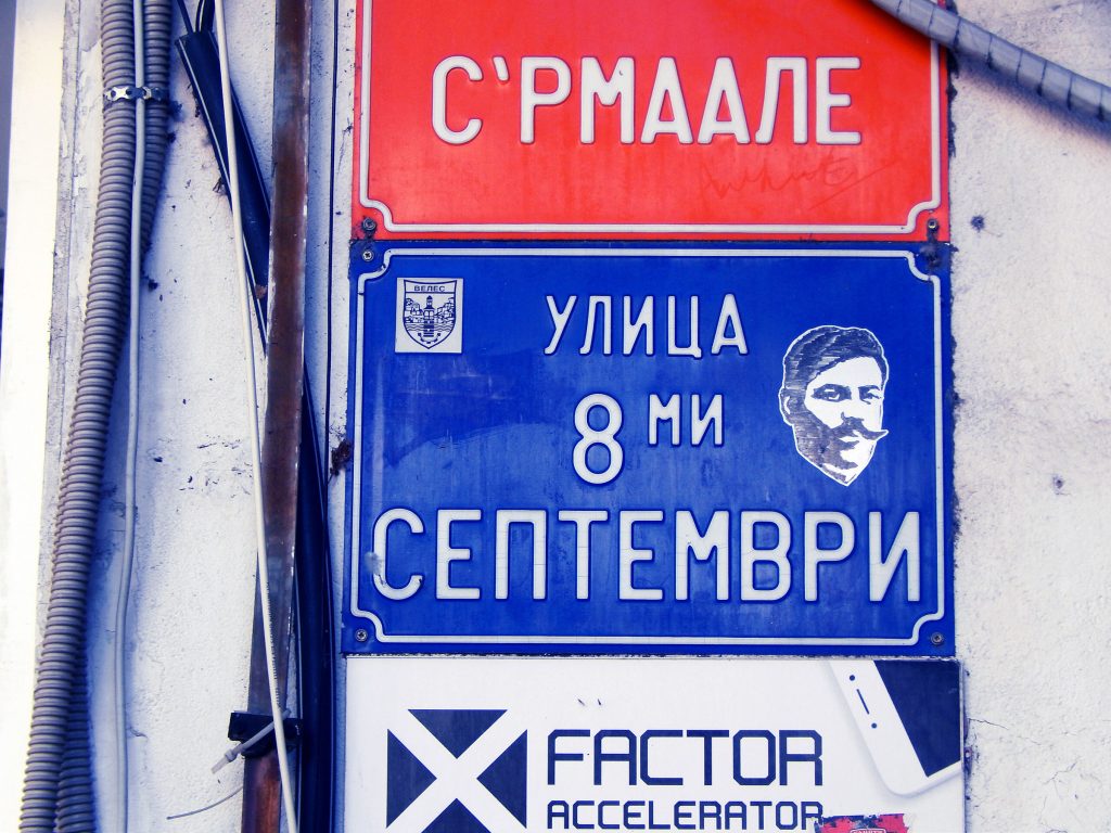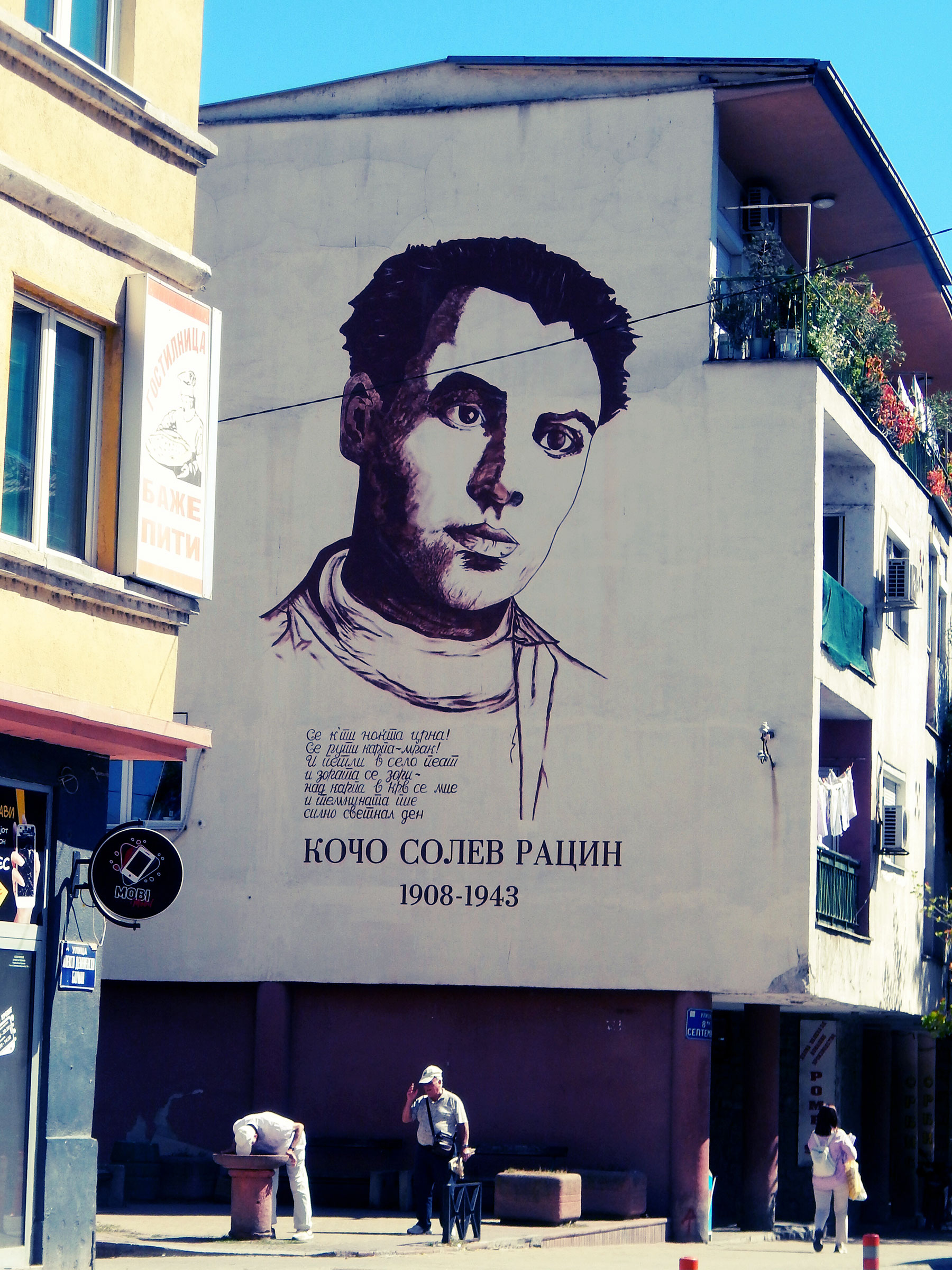Се враќам кон центарот. Добар комерцијален мурал (Миле помагај!)- за месарница! Стенсил на Гоце Делчев на табличка за улица. Двајца типови ме гледаат прашално – што па слика сега овој? Фаќам уште еден мурал (од проектот финансиран од Општината и Министерство за култура): „Велес 1908“… пак Рацин, ама барем оригинално изведено.