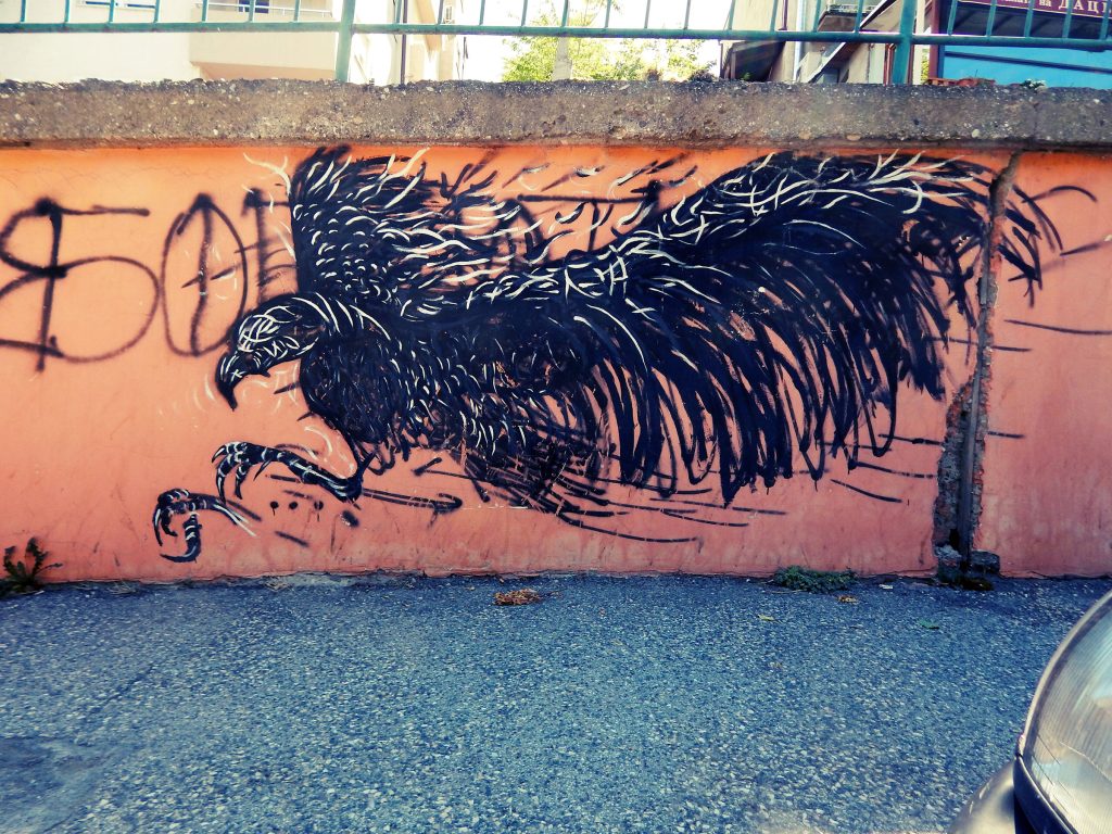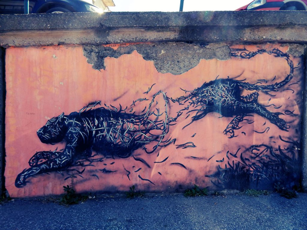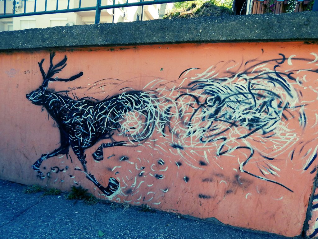 Фасадите крај главниот пат – имаат тотален Карпош/Острово вајб. Тука конечно налетувам на низа мурали од ученици (од повеќе училишта), сите во сличен – ама одличен! – експресивен реализам со апстрактни елементи: орел, елен, очи, бранови, птици, коњи, гепард…