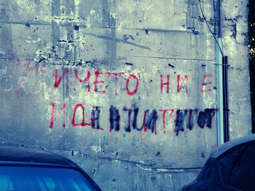 До нив фонтанче; преку – споменикот на Панко Брашнар (Гугл кажува првиот потпреседател на АСНОМ и еден од клучните архитекти на македонската државност). Карши – висококатници што ги меркав уште од центарот: ако нема „урбана“ сцена, можеби младата култура се собира под блоковите. Наоѓам нешто, ама разочарување – пак политика: „Името ни е идентитетот“. А има и – ѓубре! Конечно (иронично!). Каде што има згради, има и ѓубре. Единствениот креативен графит, прекриен со трафостаница. „ЗАБ.ПАРК“ на табла ме насмеа – звучи како забавен парк; всушност „забрането паркирање“.