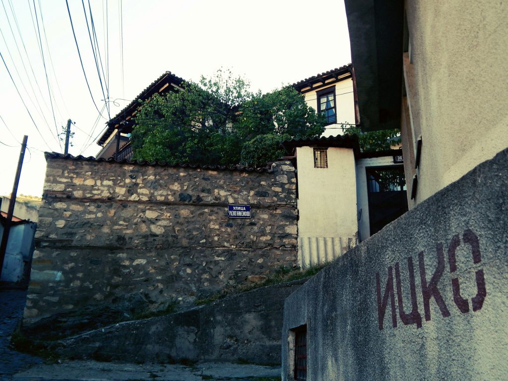 „Горното маало“ над Europe House: првата куќа – 1908 година; подолу уште неколку староградски, декорирани. Трафостаница преполна со графити – за жал, само вандализам. Погоре, на гаража: „Не паркирај“ – некој мајтапџија допишал „Оти?“.