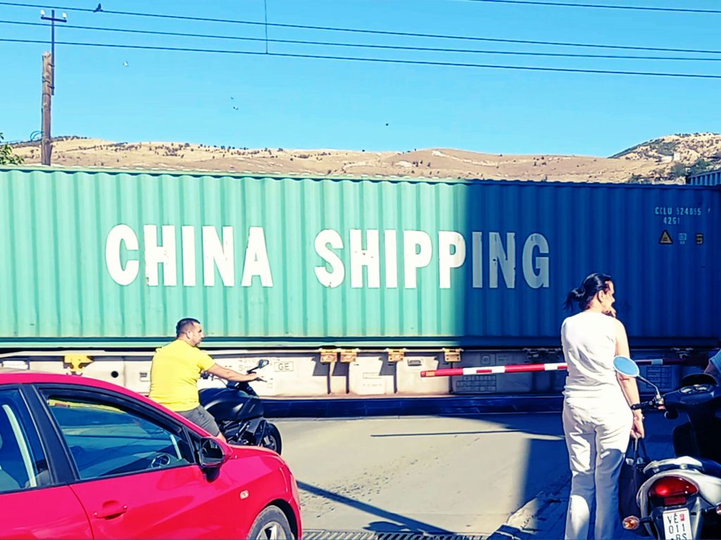 Се симнувам во градот. Слушам возови. Вагони: OOCL, China Shipping, COSCO Shipping, Dongfang, Triton, Cronos, Global, tex… Тоа се имиња на глобални контејнерски компании. Патуваат по мегапатот на кинеската трговија – Belt and Road Initiative. Македонија е на железнички коридор што врзува пристаништа (Пиреја, Солун, Бар, Драч) со Централна/Источна Европа. Велес е на Коридор 10 – Скопје-Гевгелија-Солун – линија што ја чита геополитиката на шините. Најверојатно контејнерите пристигнуваат со брод во Пиреја, па железнички низ Македонија.