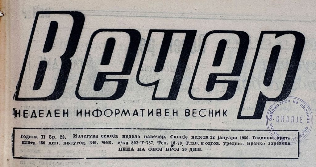 Официјалната историографија тврди дека весникот „Вечер“ е роден на 11 ноември 1963 година, како дневен пост-земјотресен градски весник. Но, хартијата пред нас раскажува друга приказна. Ова е број 26 од втората година на „Вечер – неделен информативен весник“. Математиката покажува дека првиот број излегол на 17 јули 1955 година.